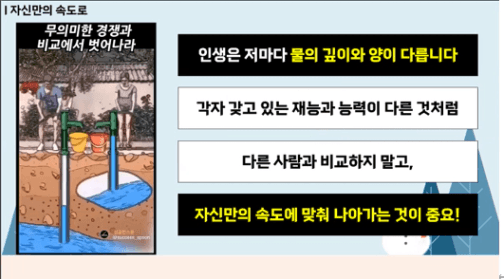 인생은 저마다의 물의 깊이와 양이 다르니 다른 사람과 비교하지 말고 자신만의 속도에 맞춰 나가자