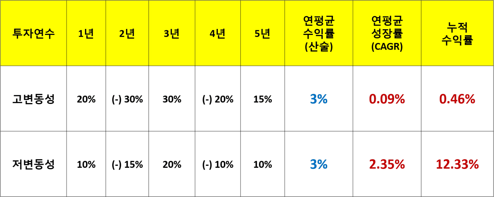 양쪽 모두 5년 연평균 수익률(산술)은 3%이지만, 고변도성의 연평균성장률(CAGR)은 0.09%, 저변동성은 2.35%로 저변동성의 연평균성장률이 큽니다.
