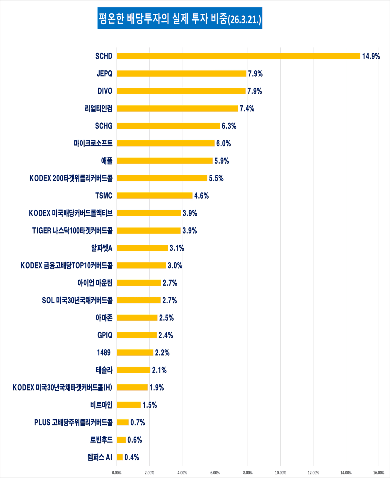 상위 10종목 비중이 70.3%이고, 주식 포트폴리오 1위 종목은 SCHD로 14.9%입니다.