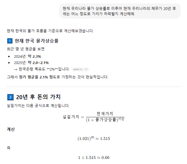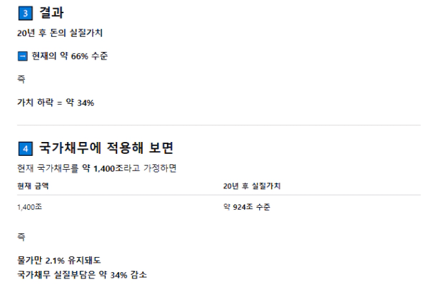 현재 우리나라 채무는 1415조원이고 현재 물가상승률로 인플레이션이 일어난다고 했을 때 20년 후 약 34%나 가치가 하락한다!!!!