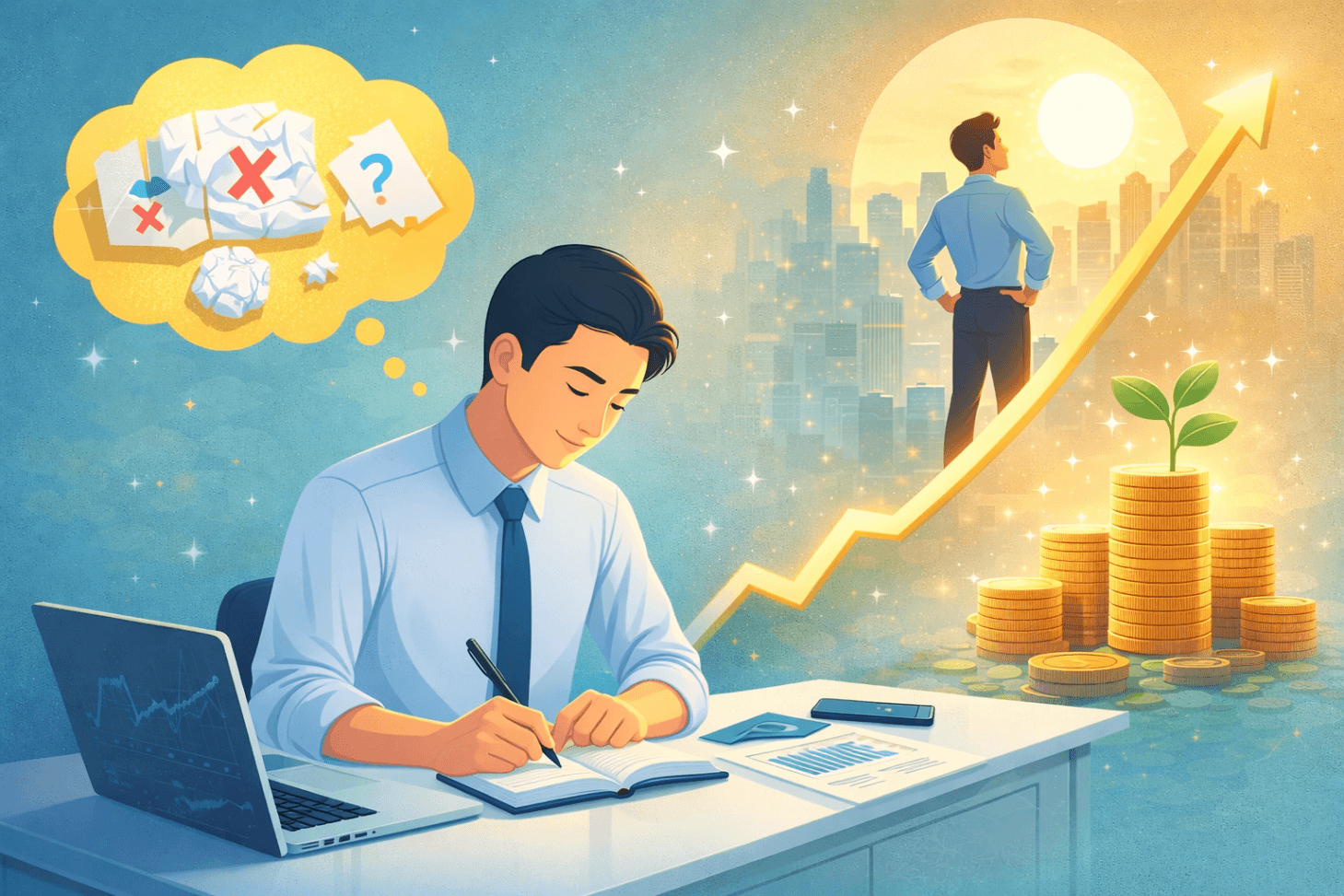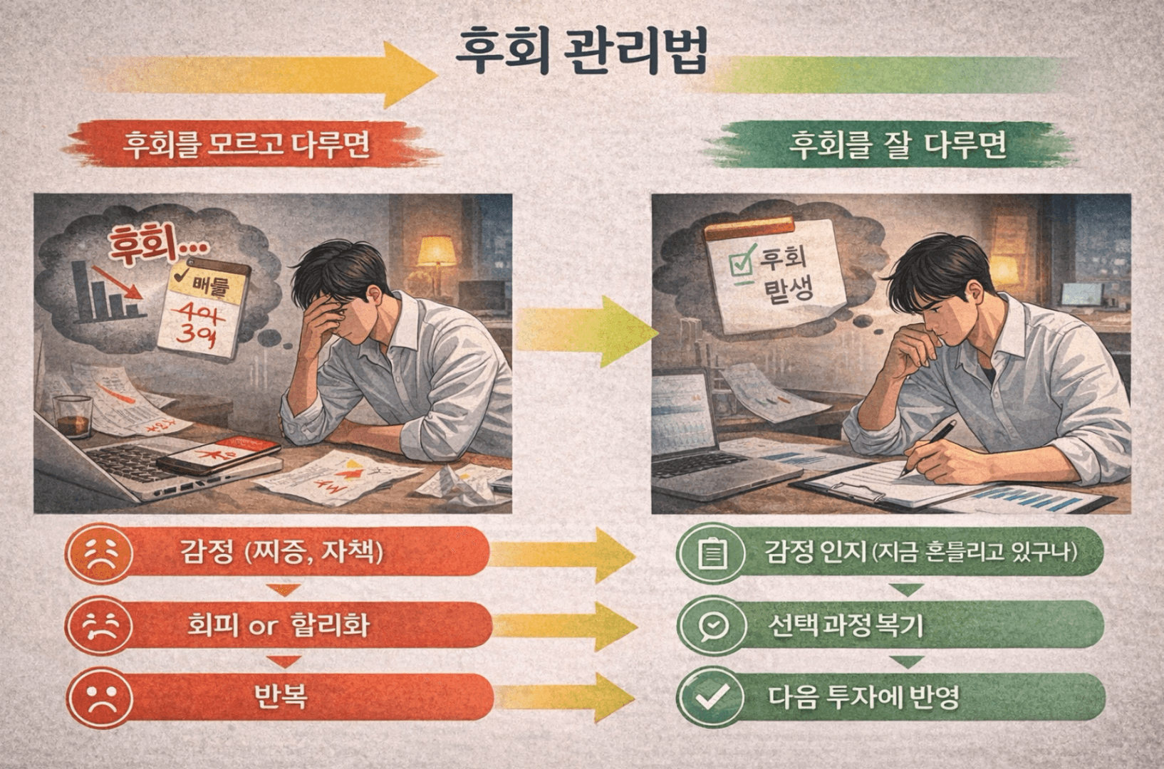 후회 발생 → 감정 인지 → 선택 과정 복기 → 의사결정 기준 점검 → 다음 투자에 반영