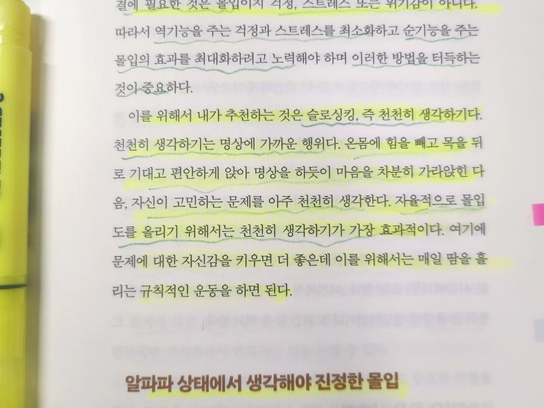: 몰입에 들어가기 위해 상각을 한곳에 집중하려면 명확한 목표가 있어야 한다. 사격을 할때 목표물을 눈으로 겨누듯이 생각으로 그 목표를 겨누는 것이다. 몰입을 제대로 체험하기 위해서는 몰입을 위한 기간이 적어도 일주일 이상은 되어야 한다. 몰입상태로 들어가기 위해서는 SNS, 유튜브,숏폼 등 외부의 정보가 자신의 뇌에 입력하는것을 가능하면 차단해야 한다. 몰입을 위해서는 직장이나 집에서 멀리 떨어진 한적한 장소를 택하는 것이 유리하며 반드시 조용하고 방해 받지 않는 독방이나 혼자만의 공간이 있어야 한다. 몰입을 시도하기 위해 슬로씽킹, 즉 천천히 생각하기가 좋다. 온몸에 힘을 빼고 목을 뒤로 기대고 편안하게 앉아 (이완) 명상을 하듯이 마음을 차분히 가라앉힌 다음, 자신이 고민하는 문제를 아주 천천히 생각한다. 여기에 문제에 대한 자신감을 키우면 더 좋은데 이를 위해서는 매일 땀을 흘리는 규칙적인 운동을 하면 된다. 몰입하는 과정에서 자신의 일에 대한 가치관이 바뀌면 자신이 하는일이 여타 다른일에 비해 훨씬 더 중요한 의미가 있으므로 자신의 인생을 송두리째 던질만한 가치가 있다는 확신이 들게 된다. 죽음과 삶에 대한 깊은 통찰과 더불어 진정으로 의미있고 행복한 삶은 자신에게 주어진 일에 몰입함으로써 얻는다는 것을 알게 되는 것이다. 몰입상태에 들어가면 이때부터 주어진 문제에 대한 유용한 아이디어가 떠오르기 시작한다. 평소에는 쉽게 떠오르지 않는 생각들이다. 아이디어가 쉽게 더오르고 문제해결력이 상승한다. 이때의 문제 해결력은 자신의 지적 능력과는 명확하게 구별할 수 있을 정도로 크게 상승한다.