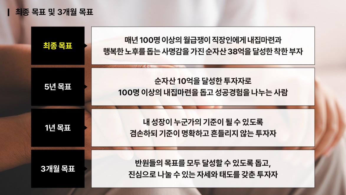 진짜 본질을 깨달을 수 있게 3개월동안 내면의 깊이를 채울 수 있게 만들어주신 밥잘튜터님, 더불어 3개월을 가치있고 의미있는 시간을 갖게 만들어주신 싣장님, 핏부님, 감부님, 집사님, 뷰님, 꾸님, 로이님, 무해님 감사하다는 말씀 꼭 드리고 싶습니다. 그리고 마지막 강의까지 진심을 다해 나눠주신 너나위님, 저희들에게 늘 귀한 강의 해주시는 양파링멘토님, 자향멘토님, 빈쓰튜터님, 메퍼튜터님, 마그온님, 딩동댕님, 험블님께도 진심으로 감사드립니다. 앞으로도 본질을 지키면서 기준을 명확히 갖고, 함께하는 가치를 잊지 않는 투자자로 성장하겠습니다.