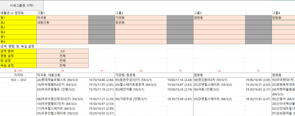 그룹별 법정동 또는 생활권을 지정하고 그룹핑 실행 시 자동으로 시세를 그룹핑해줍니다.