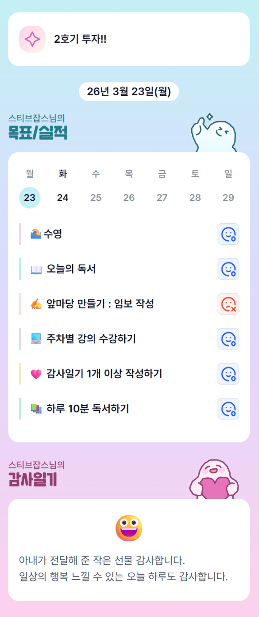 오!!! 매일 꾸준한 루틴!!! 잡스님 오늘도 수고하셨습니다^^ 남은 일주일도함께 힘내시죠.. 화이팅입니다!!!