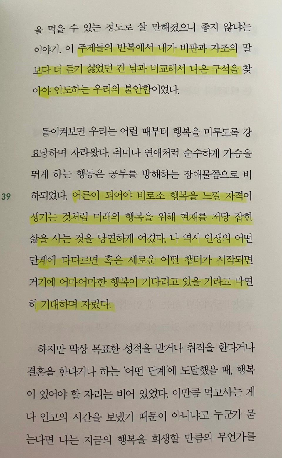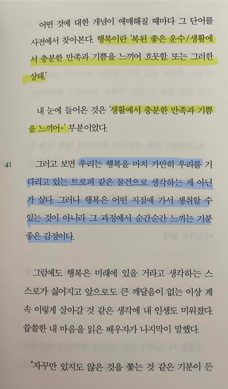 p.41 우리는 행복을 마치 가만히 우리를 기다리고 있는 트로피 같은 물건으로 생각하는 게 아닌가 싶다. 그러나 행복은 어떤 지점에 가서 쟁취할 수 있는 것이 아니라 그 과정에서 순간순간 느끼는 기분 좋은 감정이다.