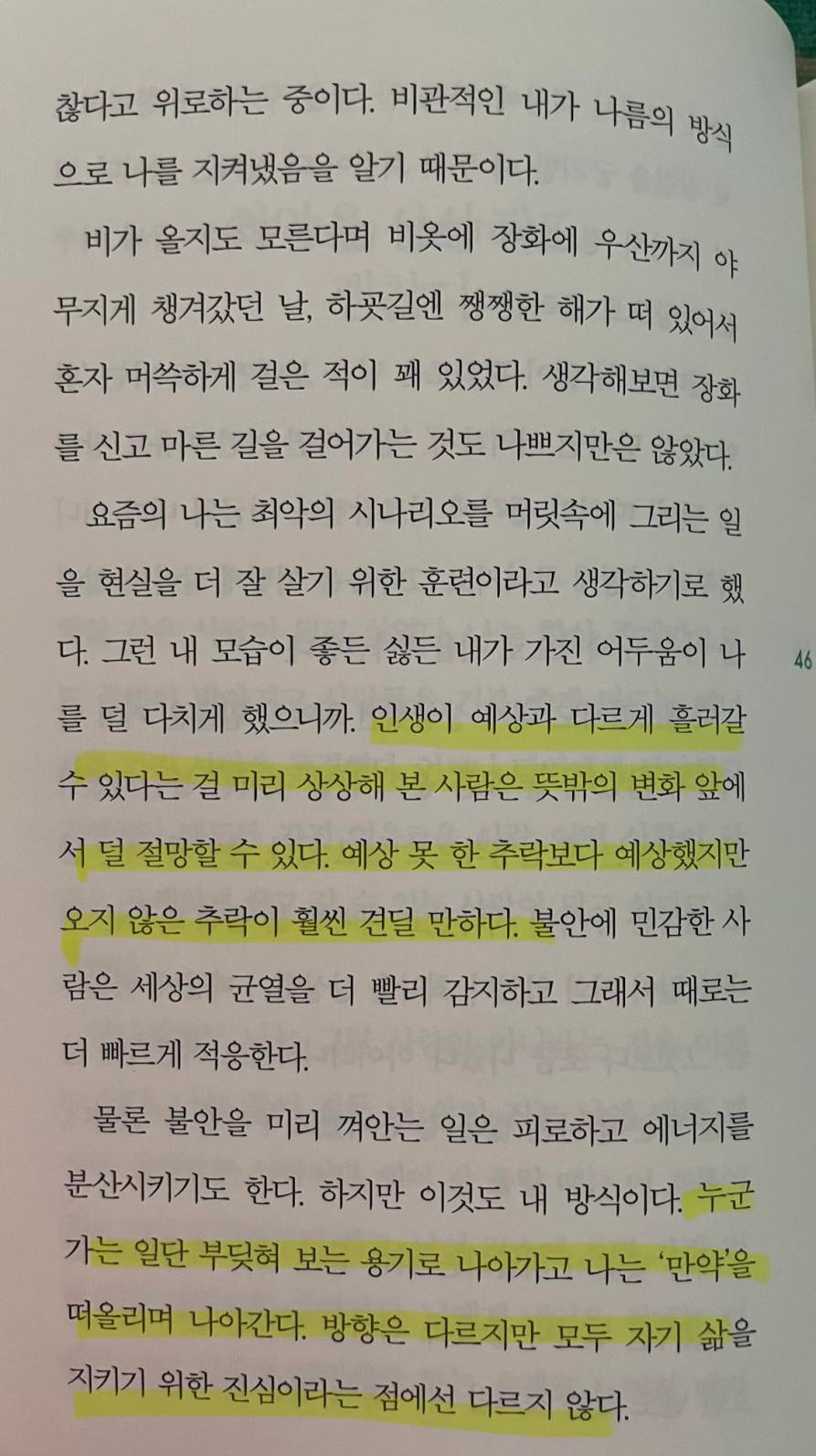 p.46 누군가는 일단 부딪혀 보는 용기로 나아가고 나는 '만약'을 떠올리며 나아간다. 방향은 다르지만 모두 자기 삶을 지키기 위한 진심이라는 점에선 다르지 않다.