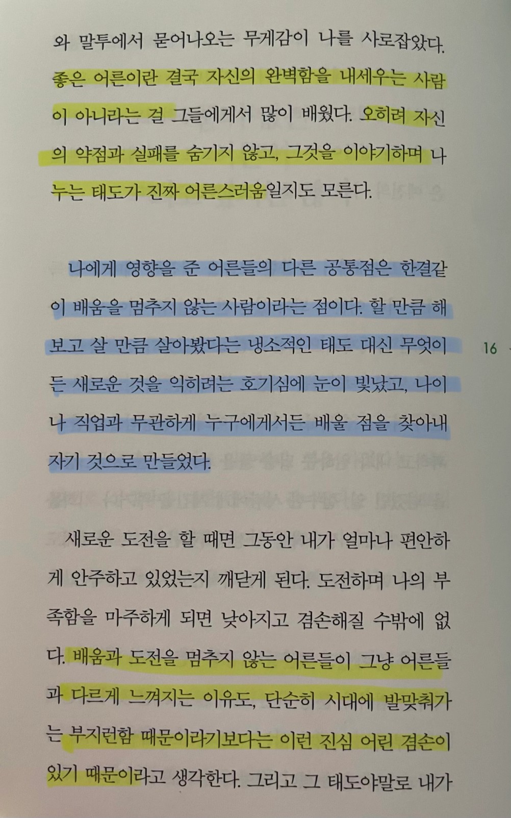 p.16 나에게 영향을 준 어른들의 다른 공통점은 한결같이 배움을 멈추지 않는 사람이라는 점이다. 할 만큼 해보고 살 만큼 살아봤다는 냉소적인 태도 대신 무엇이든 새로운 것을 익히려는 호기심에 눈이 빛났고, 나이나 직업과 무관하게 누구에게서든 배울 점을 찾아내 자기 것으로 만들었다.