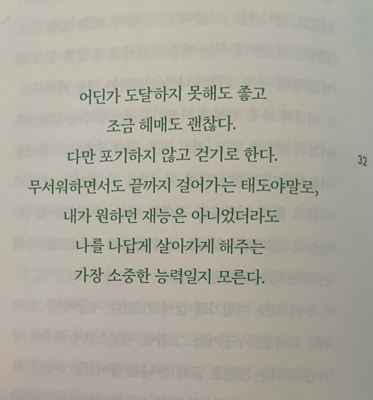 p.32 어딘가 도달하지 못해도 좋고 조금 헤매도 괜찮다. 다만 포기하지 않고 걷기로 한다. 무서워하면서도 끝까지 걸어가는 태도야말로, 내가 원하던 재능은 아니었더라도 나를 나답게 살아가게 해주는 가장 소중한 능력일지 모른다.