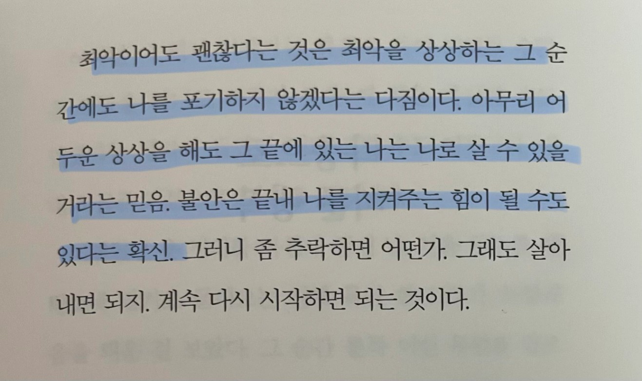 p.47 최악이어도 괜찮다는 것은 최악을 상상하는 그 순간에도 나를 포기하지 않겠다는 다짐이다. 아무리 어두운 상상을 해도 그 끝에 있는 나는 나로 살 수 있을 거라는 믿음. 불안은 끝내 나를 지켜주는 힘이 될 수도 있다는 확신. 그러니 좀 추락하면 어떤가.