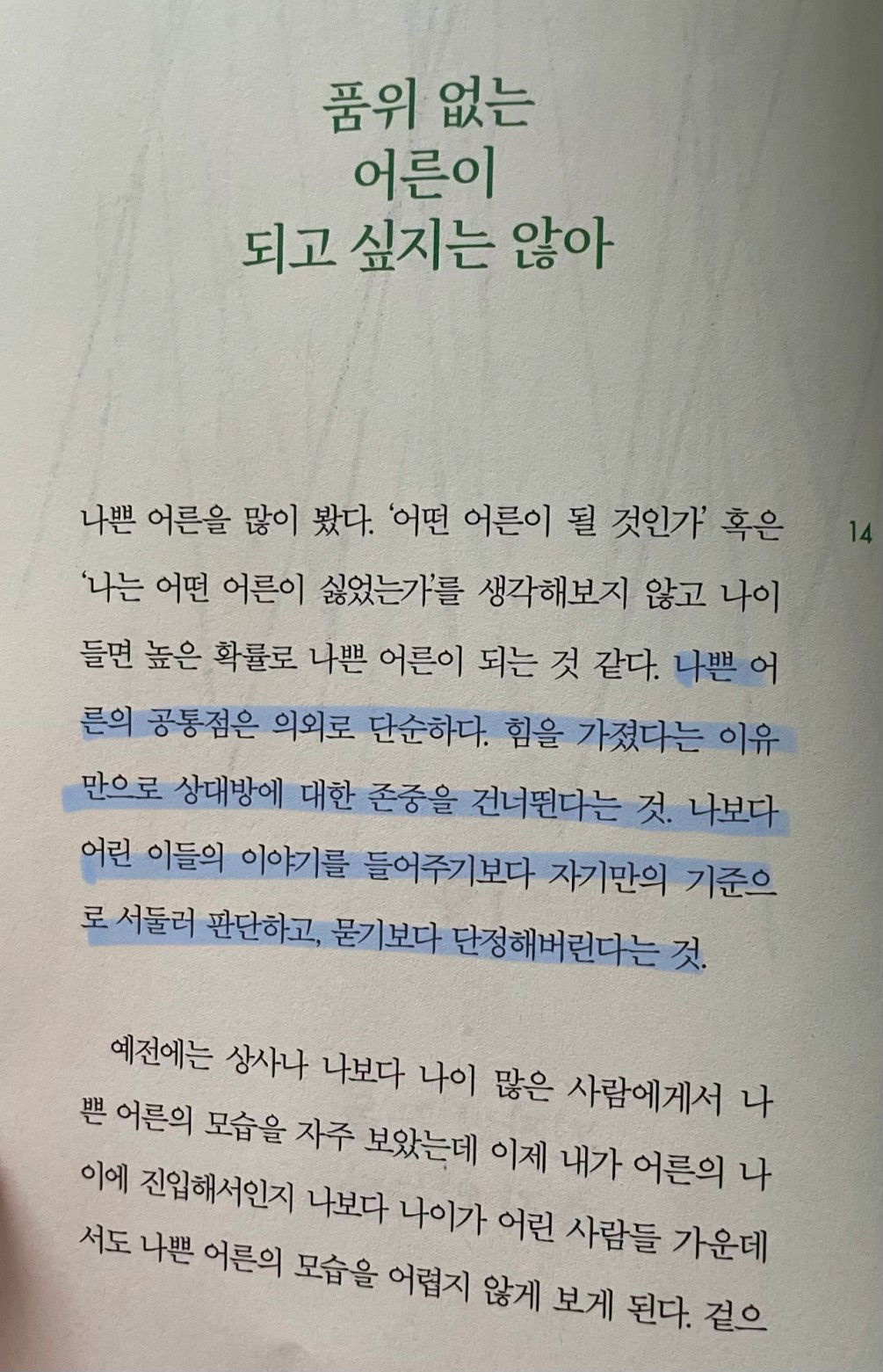 p.14 나쁜 어른의 공통점은 의외로 단순하다. 힘을 가졌다는 이유만으로 상대방에 대한 존중을 건너뛴다는 것. 나보다 어린 이들의 이야기를 들어주기보다 자기만의 기준으로 서둘러 판단하고, 묻기보다 단정해버린다는 것.