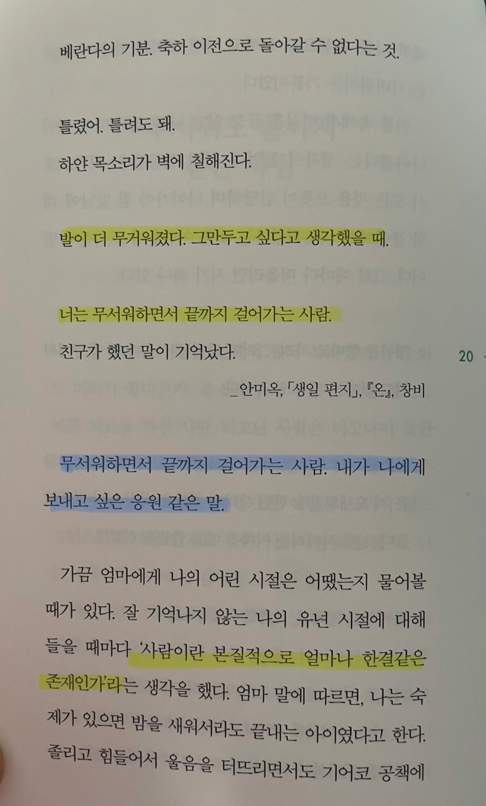 p.20 무서워하면서 끝까지 걸어가는 사람. 내가 나에게 보내고 싶은 응원 같은 말.