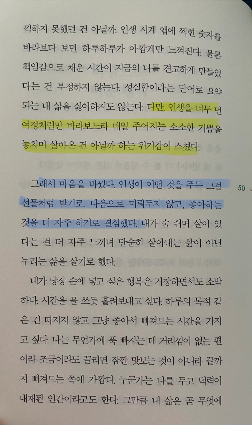 p.50 다만, 인생을 너무 먼 여정처럼만 바라보느라 매일 주어지는 소소한 기쁨을 놓치며 살아온 건 아닐까 하는 위기감이 스쳤다. 그래서 마음을 바꿨다. 인생이 어떤 것을 주든 그걸 선물처럼 받기로. 다음으로 미뤄두지 않고, 좋아하는 것을 더 자주 하기로 결심했다.