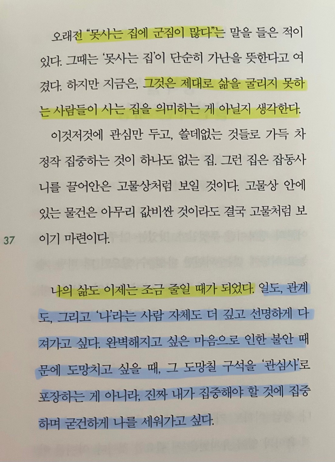 p.37 나의 삶도 이제는 조금 줄일 때가 되었다. 일도, 관계도, 그리고 '나'라는 사람 자체도 더 깊고 선명하게 다져가고 싶다. 완벽해지고 싶은 마음으로 인한 불안 때문에 도망치고 싶을 때, 그 도망칠 구석을 '관심사'로 포장하는 게 아니라, 진짜 내가 집중해야 할 것에 집중하며 굳건하게 나를 세워가고 싶다.