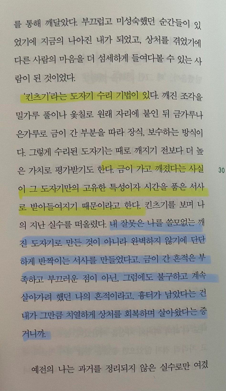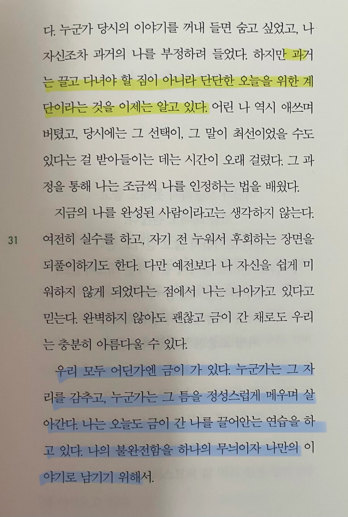 p.31 과거는 끌고 다녀야 할 짐이 아니라 단단한 오늘을 위한 계단이라는 것을 이제는 알고 있다. .. 우리 모두 어딘가엔 금이 가 있다. 누군가는 그 자리를 감추고, 누군가는 그 틈을 정성스럽게 메우며 살아간다. 나는 오늘도 금이 간 나를 끌어안는 연습을 하고 있다.