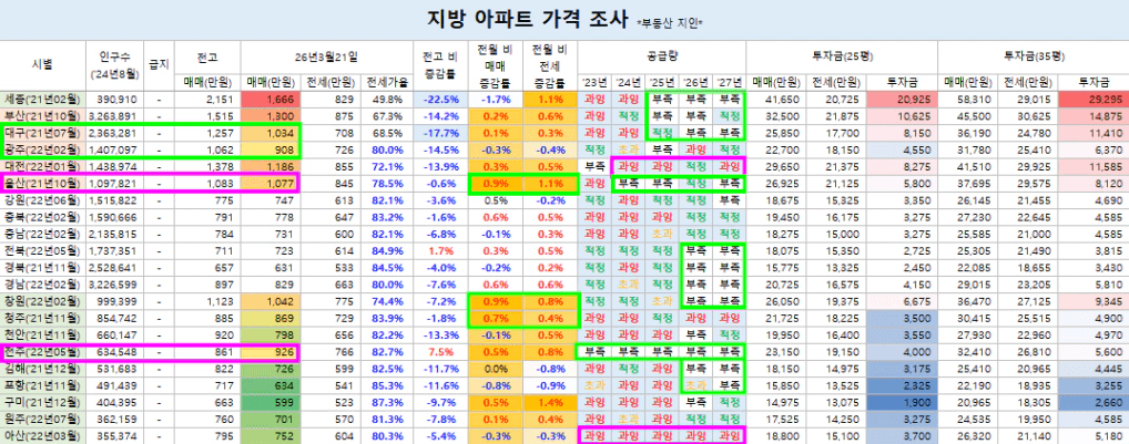 현재 공급이 부족해 투자 기회를 열어주는 지역은 전주, 울산 / 부산, 대구 / 창원, 김해이고