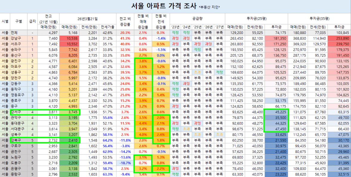 평당가 기준 지역의 입지 대비 “마곡” 일자리를 가지고 있는 강서구가 비슷한 4급지 서대문구와 비슷한 평당가를 보여주고 있어 상대적으로 저렴하다고 생각되며, 강북구 역시 비슷한 5급지인 구로구, 금천구, 노원구 대비 상당히 저렴한 평당가를 보여주고 있다고 생각한다. (반드시 단지별로 판단이 필요하다!)