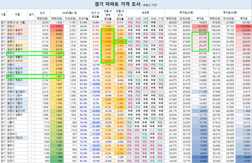 평당가 기준으로 “8호선”을 이용해 GBD(강남 주요 업무지구) 40내 주파 가능한 지역인데, 수원시 영통구, 수지구 대비 상당히 저렴한 수준이라고 판단하며, 마찬가지로 부천시의 경우 “7호선”을 이용해 인근 구디/가디, 영등포, 강남까지 1시간 안쪽으로 접근이 가능한 입지를 가지고 있음에도 그보다 물리적 위치/교통 접근성이 떨어지는 고양시 덕양구와 비슷한 평당가 수준을 보이고 있어 상대적으로 저렴하다고 생각된다. (반드시 단지별로 판단이 필요하다!)