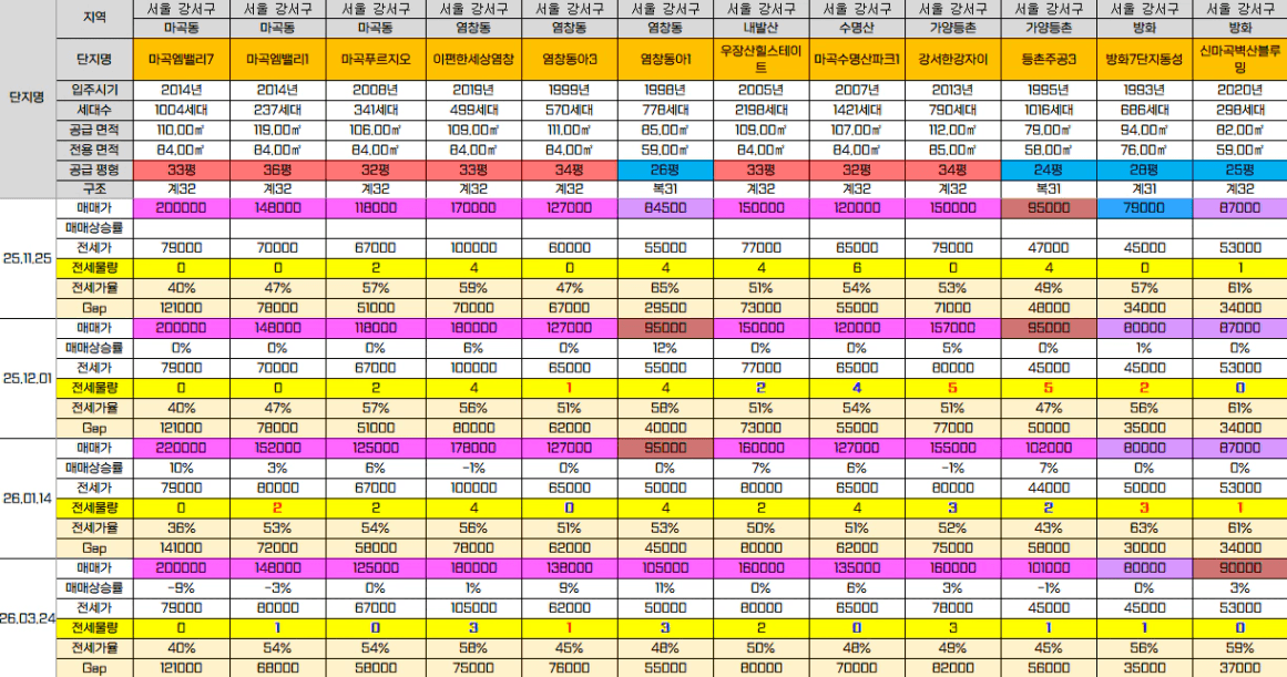 강서도 제일 좋은 곳은 떨어지고 아래 있던 것들이 좀 올라온 모습을 보인다. 전세는 줄었고, 매매 매물도 줄었다. 7단지 동성은 낀평형 매물이 아예 없다. 방화를 제외하고 10억 아래 있던 것들이 다 올라와 호가 10억을 넘었다. 그래도 전세가율 60을 넘는 곳은 보이지 않음.