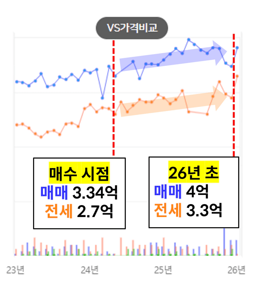 2년이 채 안되어 매매가/전세가 모두 6천만원 이상 상승하였습니다.