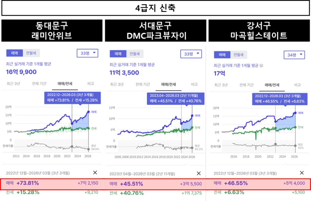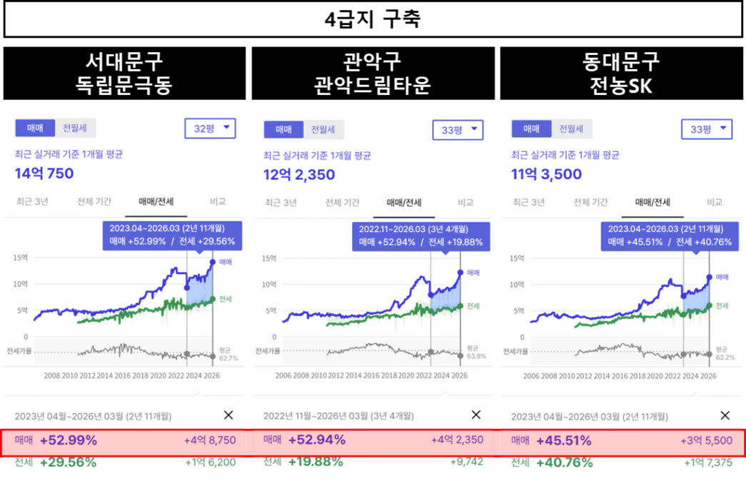 4급지 구축도 신축과 마찬가지로 40~50% 상승률을 기록하고 있습니다.