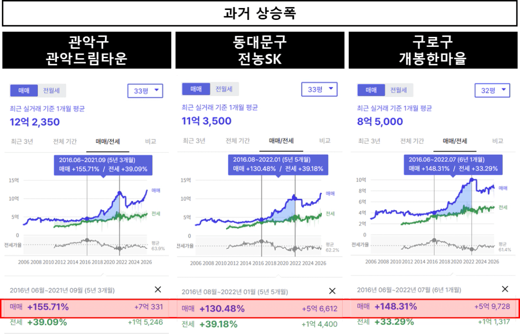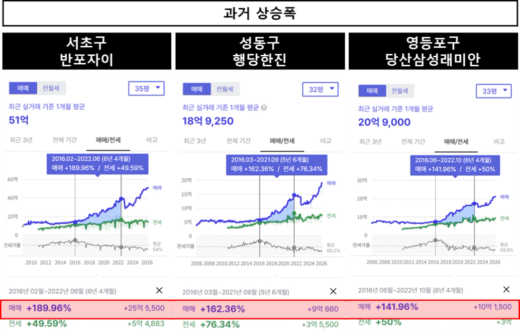 위 단지들은 지난 상승장에서 2016년부터 2022년까지 약 150~190% 정도의 매매 상승률을 보였습니다.