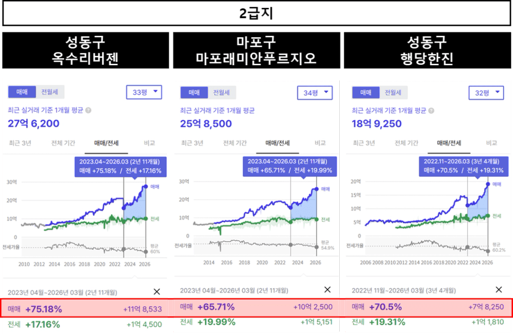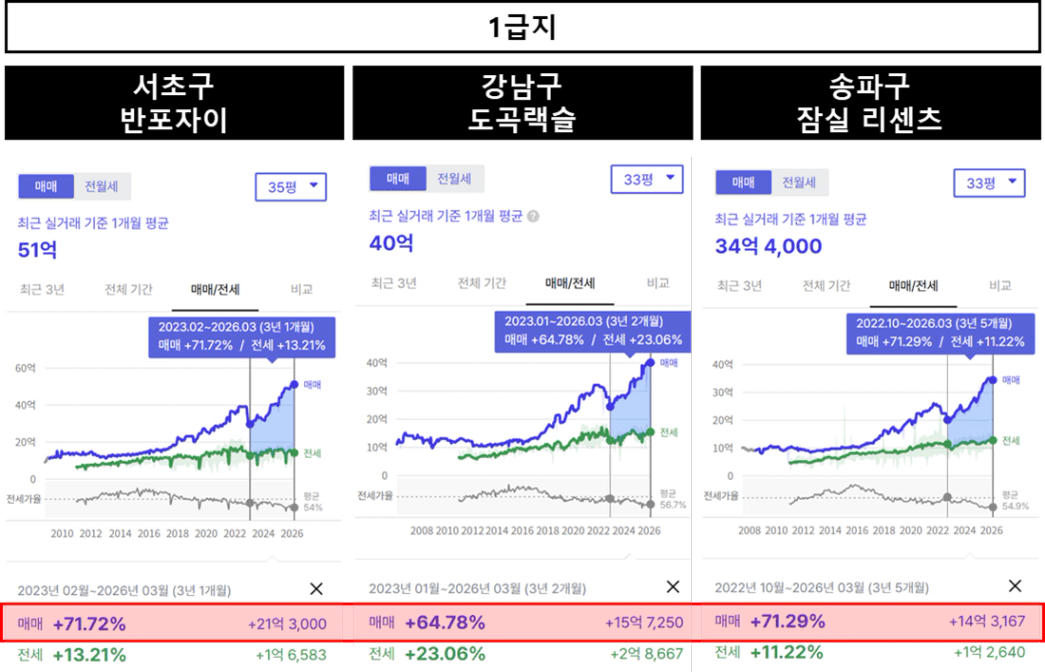 1급지는 매매가 수준이 매우 높기때문에 상승률이 70%이라는 것은 가격이 굉장히 많이 상승했다고 볼 수 있습니다.