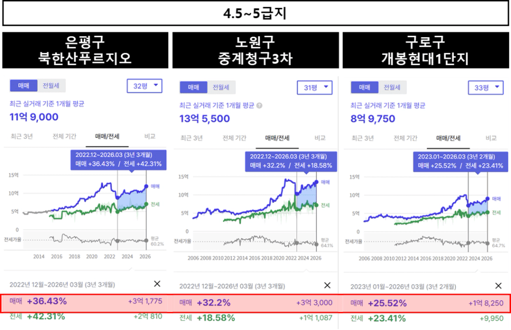 마지막으로 4.5~5급지로 불리는 은평, 노원, 구로의 단지들은