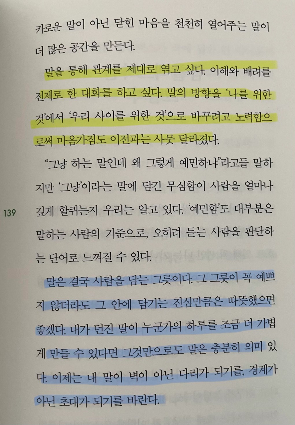 p.139 말은 결국 사람을 담는 그릇이다. 그 그릇이 꼭 예쁘지 않더라도 그 안에 담기는 진심만큼은 따뜻했으면 좋겠다. .. 내 말이 벽이 아닌 다리가 되기를, 경계가 아닌 초대가 되기를 바란다.
