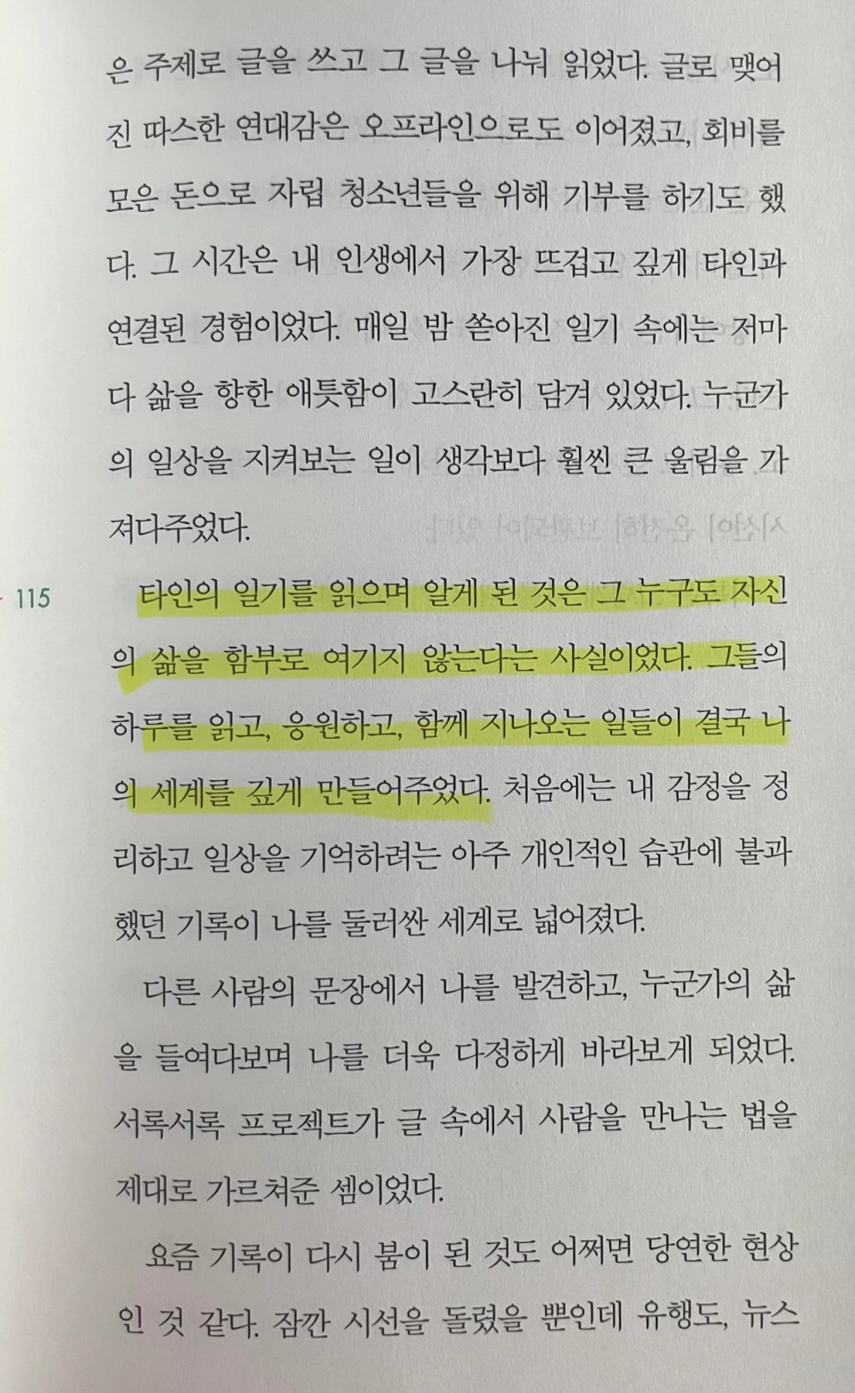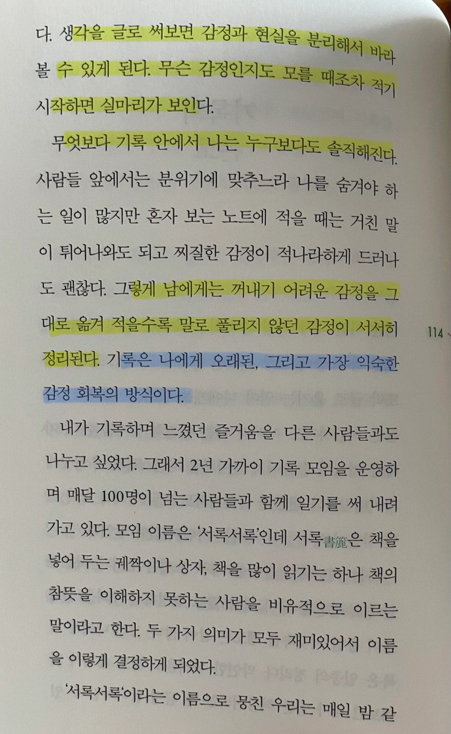 p.114 그렇게 남에게는 꺼내기 어려운 감정을 그대로 옮겨 적을수록 말로 풀리지 않던 감정이 서서히 정리된다. 기록은 나에게 오래된, 그리고 가장 익숙한 감정 회복의 방식이다.