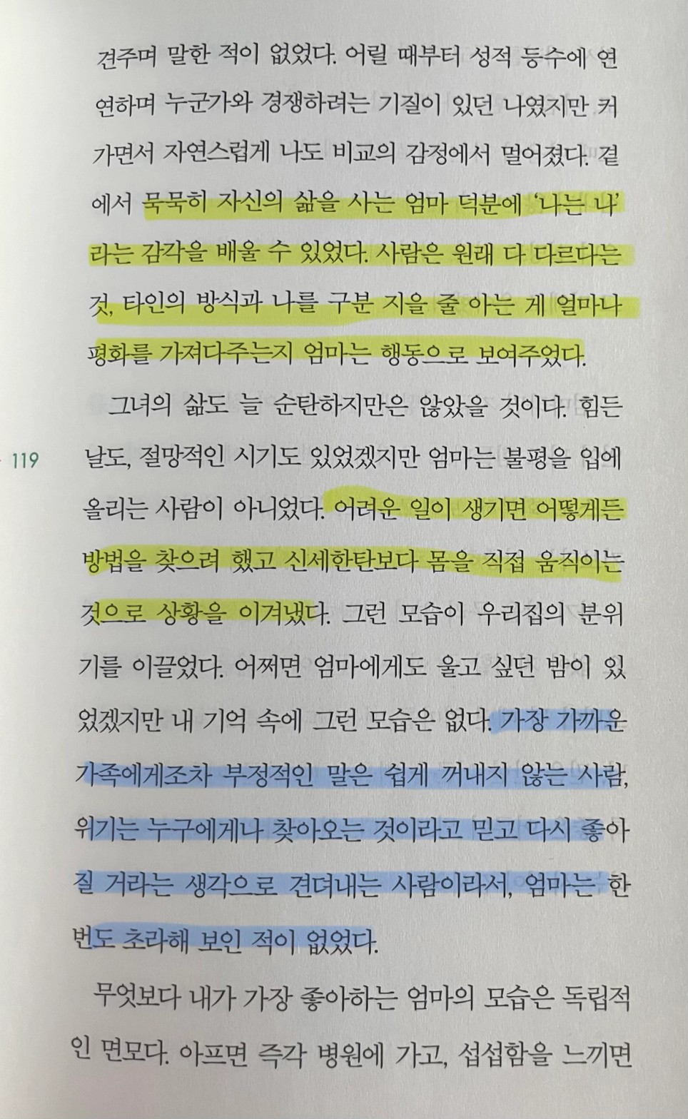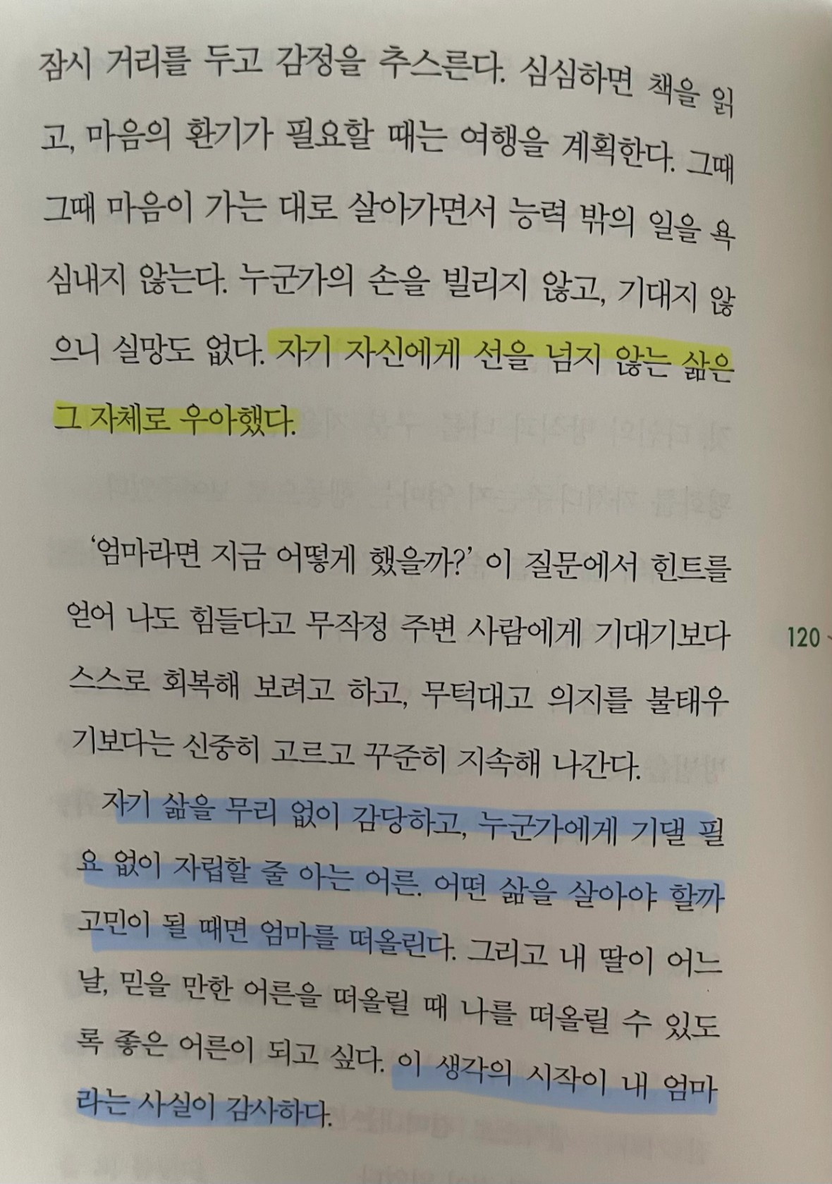 p.120 자기 삶을 무리 없이 감당하고, 누군가에게 기댈 필요 없이 자립할 줄 아는 어른. 어떤 삶을 살아야 할까 고민이 될 때면 엄마를 떠올린다. .. 이 생각의 시작이 내 엄마라는 사실이 감사하다.