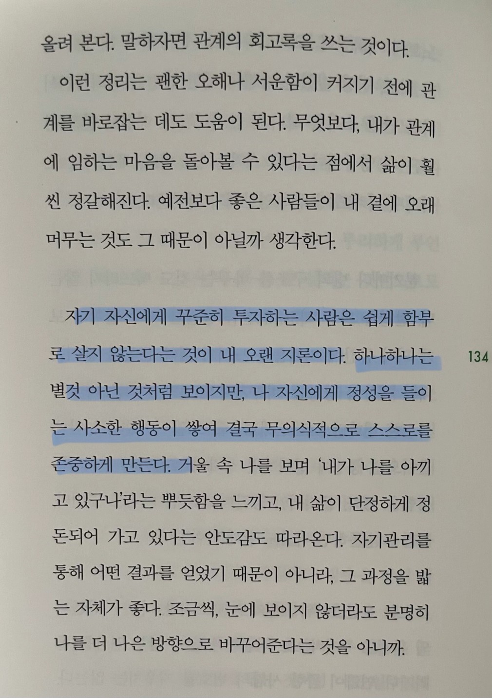 p.134 자기 자신에게 꾸준히 투자하는 사람은 쉽게 함부로 살지 않는다는 것이 내 오랜 지론이다. 하나하나는 별것 아닌 것처럼 보이지만, 나 자신에게 정성을 들이는 사소한 행동이 쌓여 결국 무의식적으로 스스로를 존중하게 만든다.