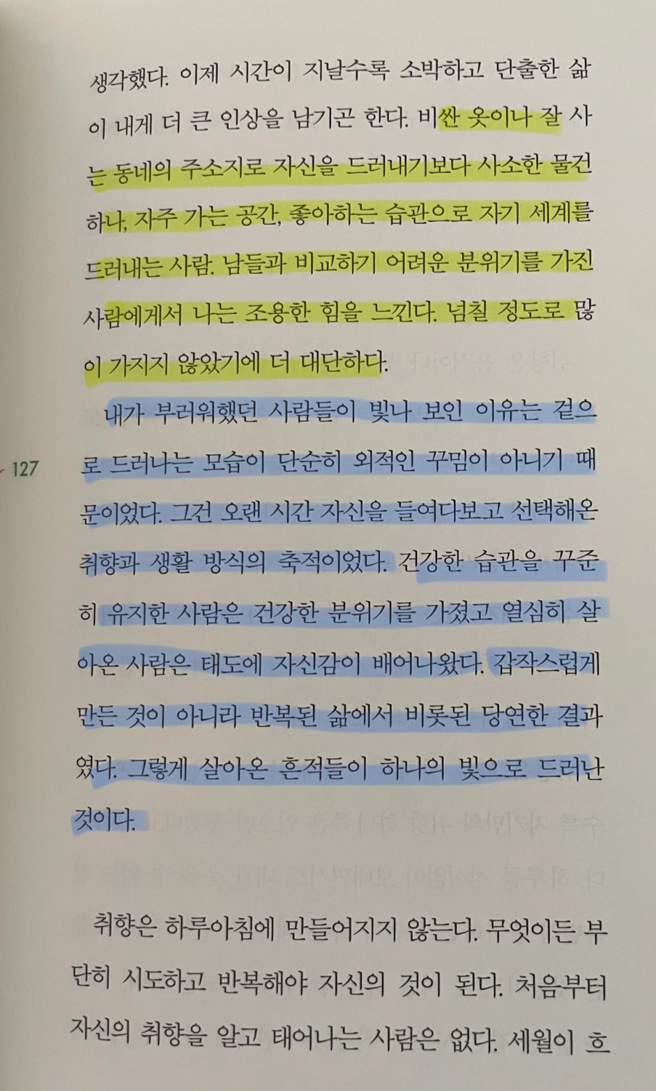 p.127 내가 부러워했던 사람들이 빛나 보인 이유는 겉으로 드러나는 모습이 단순히 외적인 꾸밈이 아니기 때문이었다. 그건 오랜 시간 자신을 들여다보고 선택해온 취향과 생활 방식의 축적이었다. 건강한 습관을 꾸준히 유지한 사람은 건강한 분위기를 가졌고 열심히 살아온 사람은 태도에 자신감이 배어나왔다. 갑작스럽게 만든 것이 아니라 반복된 삶에서 비롯된 당연한 결과였다. 그렇게 살아온 흔적들이 하나의 빛으로 드러난 것이다.
