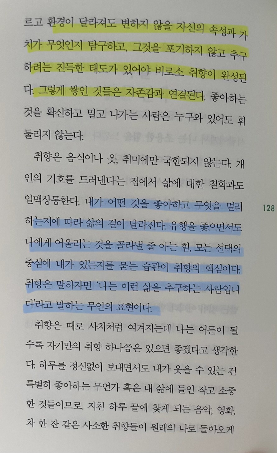 p.128 내가 어떤 것을 좋아하고 무엇을 멀리 하는지에 따라 삶의 결이 달라진다. 유행을 좇으면서도 나에게 어울리는 것을 골라낼 줄 아는 힘, 모든 선택의 중심에 내가 있는지를 묻는 습관이 취향의 핵심이다. 취향은 말하자면 '나는 이런 삶을 추구하는 사람입니다'라고 말하는 무언의 표현이다.