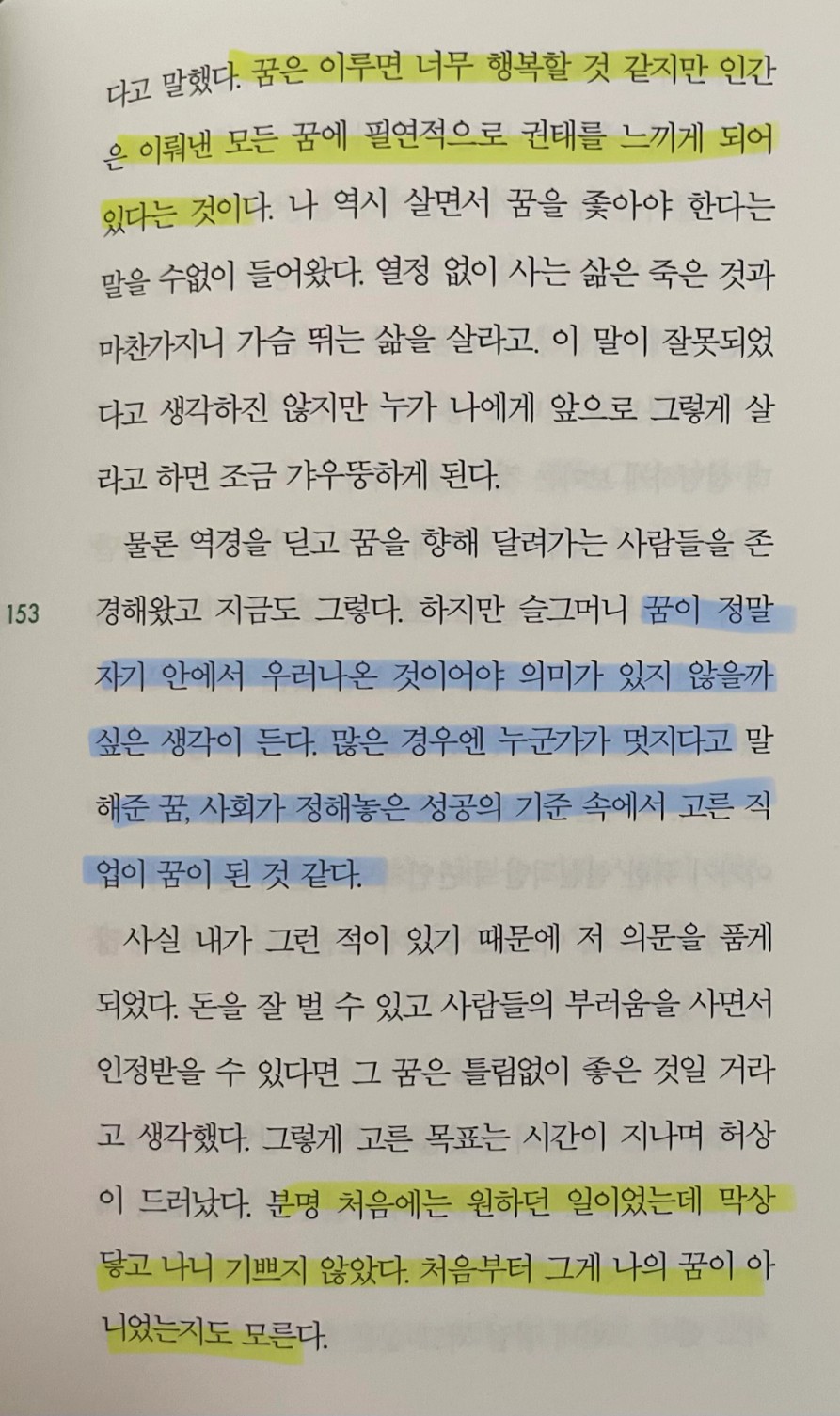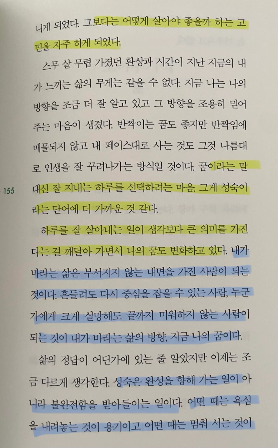 p.155 내가 바라는 삶은 부서지지 않는 내면을 가진 사람이 되는 것이다. 흔들려도 다시 중심을 잡을 수 있는 사람, 누군가에게 크게 실망해도 끝까지 미워하지 않는 사람이 되는 것이 내가 바라는 삶의 방향, 지금 나의 꿈이다. .. 성숙은 완성을 향해 가는 일이 아니라 불완전함을 받아들이는 일이다.