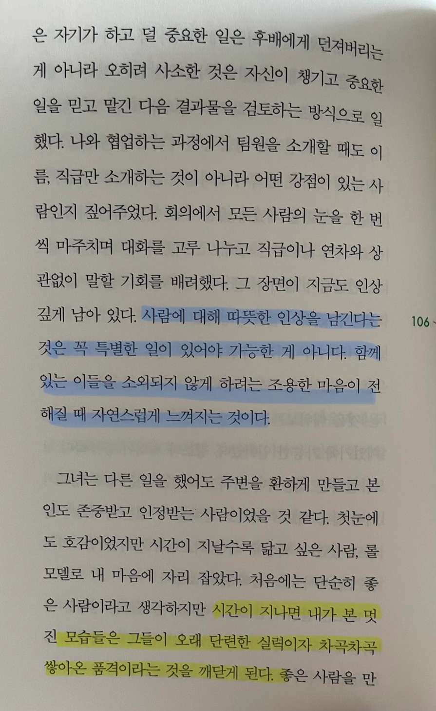 p.106 사람에 대해 따뜻한 인상을 남긴다는 것은 꼭 특별한 일이 있어야 가능한 게 아니다. 함께 있는 이들을 소외되지 않게 하려는 조용한 마음이 전해질 때 자연스럽게 느껴지는 것이다.