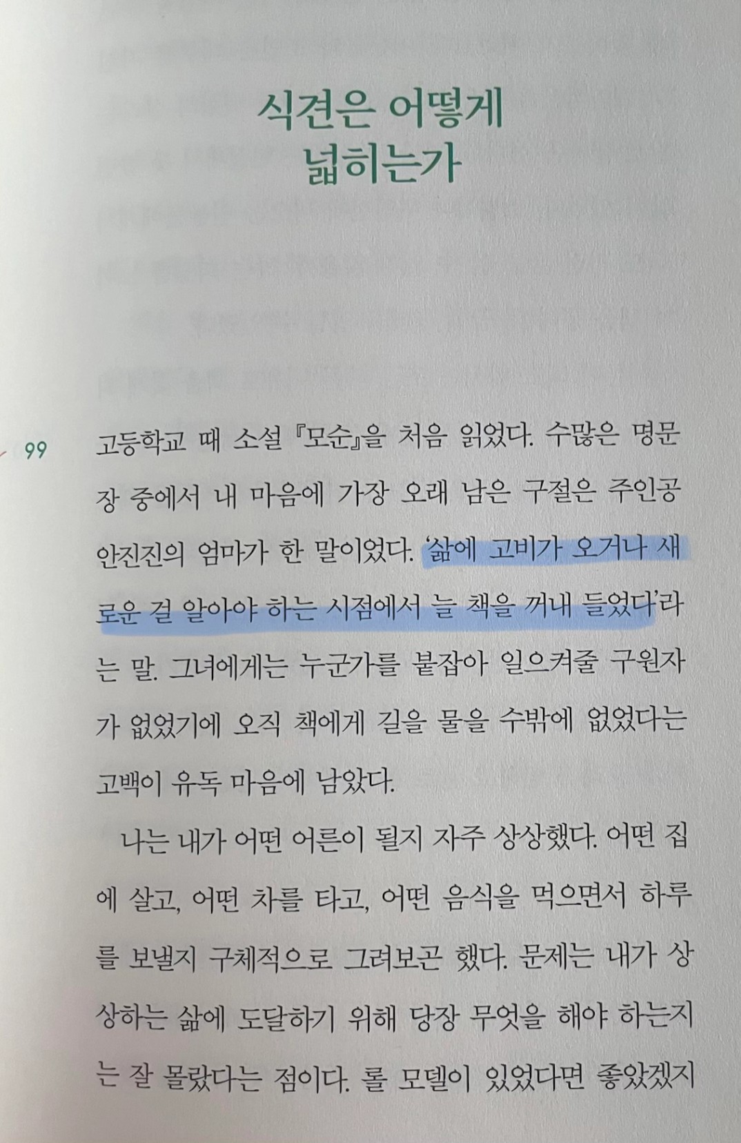p.97 내가 어떤 사람인지는 내가 당장 할 줄 아는 것이나 지금 하고 있는 일만으로 설명되지는 않는다. 오히려 내가 어디까지 보고 이해할 수 있느냐가 나라는 사람의 깊이와 넓이를 결정짓는다고 생각한다.