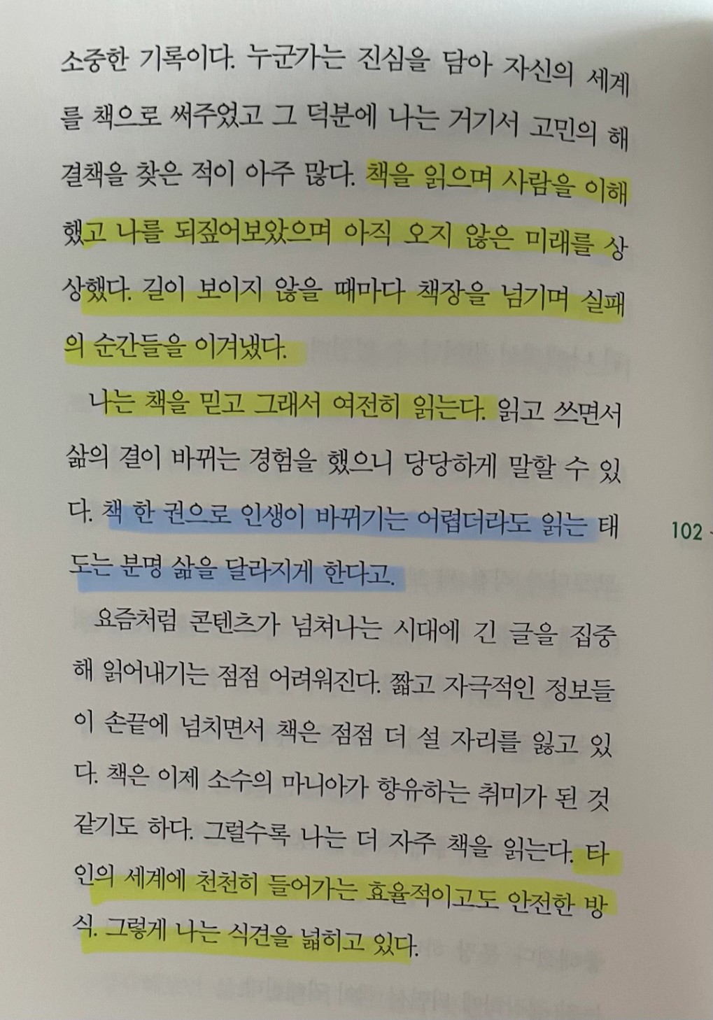 p.102 책을 읽으며 사람을 이해했고 나를 되짚어보았으며 아직 오지 않은 미래를 상상했다. 길이 보이지 않을 때마다 책장을 넘기며 실패의 순간들을 이겨냈다. .. 책 한 권으로 인생이 바뀌기는 어렵더라도 읽는 태도는 분명 삶을 달라지게 한다고.