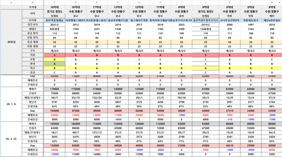 수원 영통구 전반적으로 전세가격이 많이 올랐다. 수도권 전체적으로 전세가 없다보니까 전세가격이 많이 상승한듯. 상위 생활권 단지들은 매매가격도 많이 오른 반면, 후순위 생활권들은 전세가격이 오른것에 비해 매매가격은 호가가 떨어진 것들이 보인다. 아마 다주택자 매물들이 있어서 그런듯.