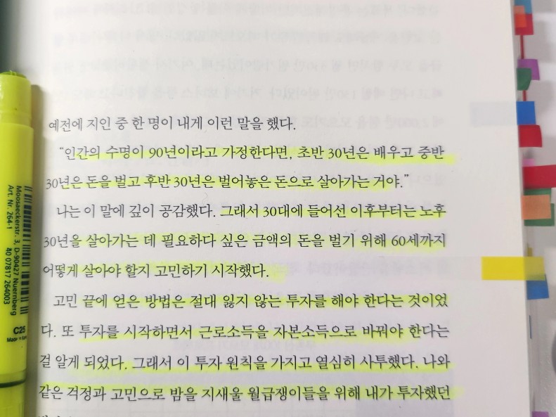 : 회사는 직원을 부자로 만들어 주지 않는다. 직원이 회사를 위해 많은 돈을 벌어다 줘도 결국 주주나 CEO의 배만 불러나간다는 걸 깨달았다. 월급만으로는 가난에서 벗어날수 없다는 사실. 경험상 성공적인 투자를 위해 가장 필요한 것은 ‘선입견을 배제하고 물건 본연의 가치를 바라볼수 있는 눈’이다. 내 앞에 지나가는 나쁜 볼(기회)에는 손대지 않지만, 내앞에 좋은 볼이 오면 그걸 포착해 바로 타격에 나선다. 잔인한 말같지만, 자본주의의 원리를 깨달은 사람은 더 큰 부를 쌓을것이고, 그원리를 깨닫지 못한 사람은 계속해서 깨달은 사람이 더 많은 부를 쌓게 도울 것이다. 자본주의는 바다의 밀려오는 파도와 같다. 우리 앞으로 계속 밀려오는 이 파도는 이를 활용해 능동적으로 움직이는 사람에게는 인생을 즐길수 있는 좋은 서핑의 기회가 괼수 있겠지만, 스스로 헤엄치려고 하지 않는 사람에게는 목숨을 위협할 수 있는 고난이 될수 있다. 투자자가 세금을 많이 낸다는것은 그만큼 수익이 많다는 것이고 연봉이 높다는것과 비슷한 이야기다. 어떤사람이 회사까지 차를 운전해 가는데 든느 기름값이 아까워서 회사를 가지 않겠다고 한다면 어떤가? 우리가 투자를 하는것은 세금을 덜 내기 위해서가 아니라 수익을 많이 얻기 위해서라는 사실을 기억해야 한다.
