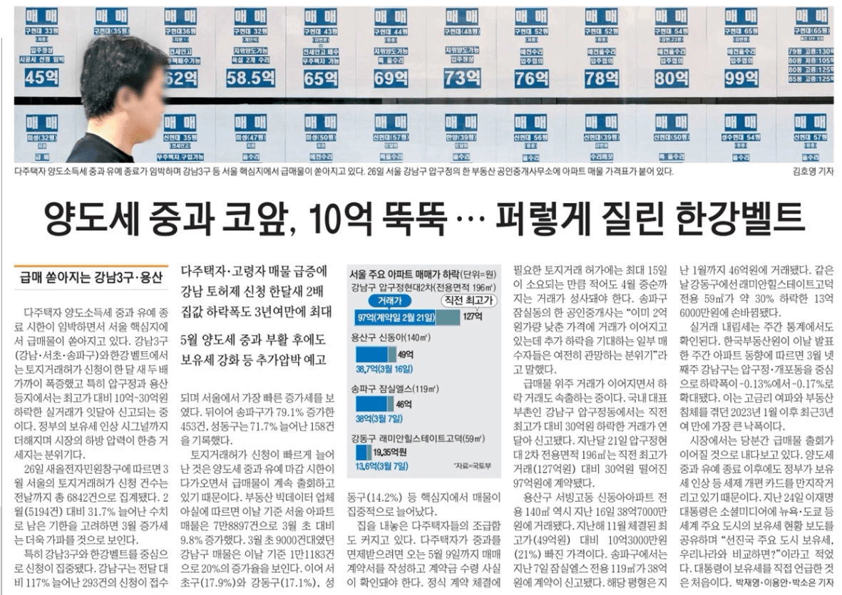 → 양도세 중과 유예 마감 시한을 앞두고 강남, 용산 등지에서 전고 대비 10~30억 저렴한 실거래가가 나오는 중. 양도세 중규 유예 종료 시점인 5월 9일 이후에도 보유세 인상 등의 추가 세제 개편 가능성이 남아 있어 이 흐름이 한동안 유지될 것으로 예상