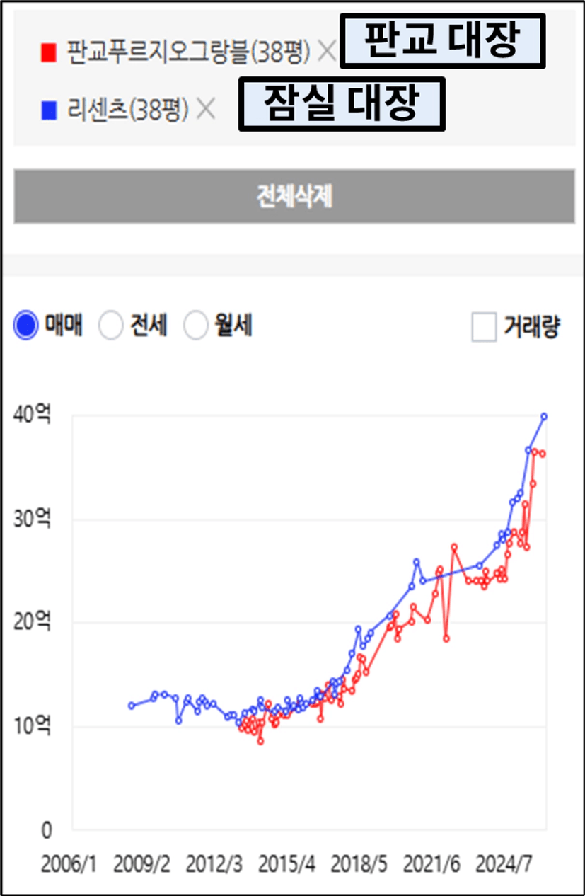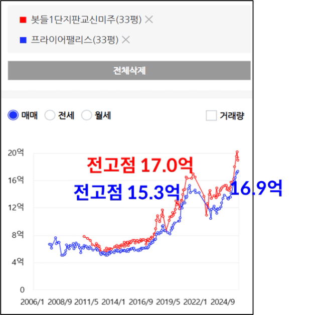 단순한 비교는 어렵지만, 두 단지의 가격 흐름은