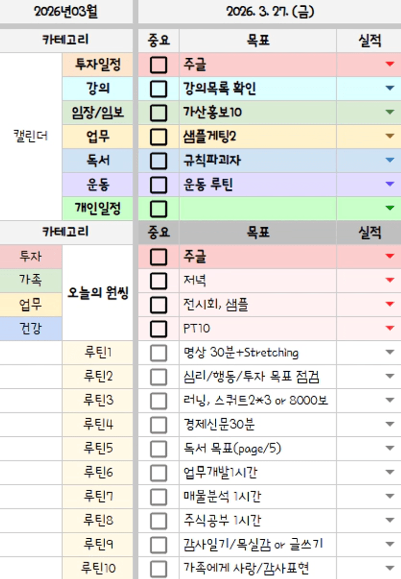 아침에 계획을 세우고 저녁에 복기를 합니다.