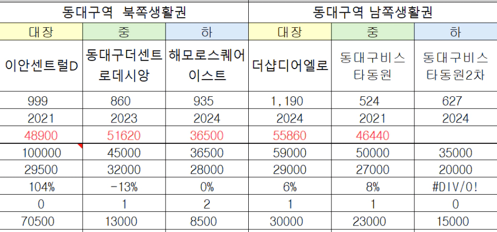 남쪽 생활권이 전세가격은 좀 더 낮고 매매가는 더 높은 경향이 있다.
