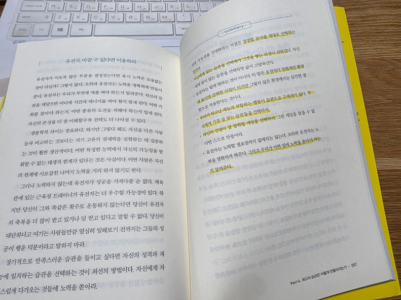 <습관은 시간과 함께 그 영향력이 더욱 강화된다. 습관은 세운다는 것은 자기 자신을 만들어나가는 과정. 우리는 조금씩 매일매일, 하나하나씩 변화한다. 자아는 아주 미세하게 지속적으로 진화해나간다.>