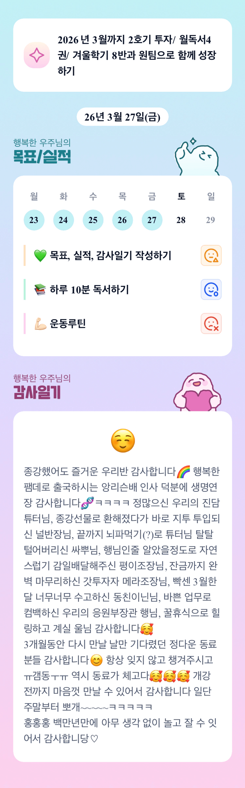 우주님 3개월간 수고 많으셨어요!! 방학기간 쉰나게 쉬고~ 봄학기도 뿌시고 오셔요!!! 멀리 남쪽에서 항상 응원 합니다!!!^^