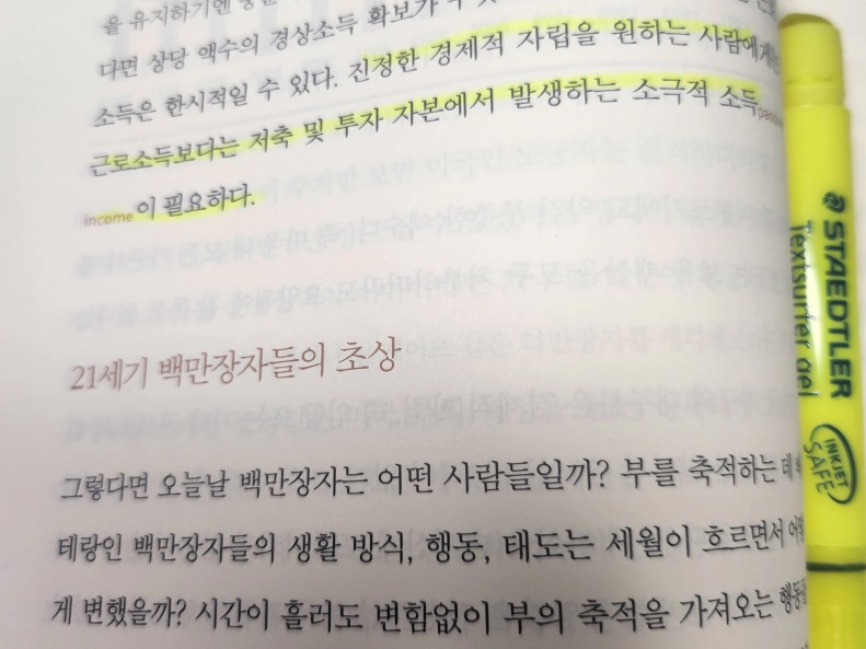 : 이웃집 백만장자는 그저 꾸준히 절약하고 재산 축적에 도움이 되는 선택을 수십년 동안 해온 결과가 부자가 됐다. 진정한 경제적 자립을 원하는 사람에게는 근로소득보다는 저축 및 투자 자본에서 발생하는 소극적 소득이 필요하다. 백만장자의 약 90%가 삶에 만족한다. 그중 80%는 대체로 꾸준히 신체건강을 유지하고 있다고 이야기하며, 평균7.65시간 잠을 잔다. 백만장자들은 예산을 세워가며 생활하며 절약한다. 그들의 70%는 한해 의식주의 비용으로 얼마를 쓰는지 알고 있으며 59%는 늘 검소하게 생활한다. 60%는 절약이 성공의 결정적 요인이라고 생각한다. 더중요하게는 부와 관련된 태도와 행동에 다음과 같은 중대한 변화가 있어야 한다. 부란 무엇이며 어떻게 축적되는지에 관한 여 여러 통념을 이해하고 떨쳐버려야 한다. 경제적 성공을 이룬 사람들에 대한 비난을 중지하고 자신의 독특한 배경과 재능을 바탕으로 성공할 방법을 검토해야 한다.(자신이 경멸하는 사람이 될순 없진 않은가?)현재 주위에 있는 모든사람과 성장 과정에서 주위에 있었던 사람들이 재정적 문제를 어떻게 다뤘는지 검토해볼 필요가 있다. 부모와 양육자의 실수를 답습할 필요가 없음을 인식해야 한다. 더 중요하게는 주변 사람들이 당신의 재정적 행동에 얼마나 영향을 미치는지 인지하고, 그런 영향을 계속 허용할지 말지 의식적인 결정을 내릴 필요가 있다. 집과 차 같은 주요 구매부터 작은 물건의 구매까지 자신의 소비행동을 숙고해야만 한다. 당신과 당신의 가정이 어디에 자리잡는가는 다른 중요한 재정적 결정에 상당한 영향을 미칠 것이다. 그런 구매 결정들이 전반적인 재정적 목표에 도움이 되는지, 화려한 갑부들이나 부유한 척 하는 사람들을 모방하려는건 아닌지 판단해야만 한다. 부를 쌓으려면 스스로 수입을 창출해야 하므로 일이 자신에게 어떤 의미가 있는지 성찰해야 한다. 그렇게 얻은 수입을 투자를 통해 키운다. 어떻게 투자를 할지, 어디서 재정적 조언을 얻을지 숙고한 후에 결정한다. 인지 자원을 어떻게 쓸지도 계획적으로 결정해야 한다. 우리의 관심과 시간은 재생불가능한 자원으로, 우리가 경제적 자유를 얻을 기회를 늘려줄 수도 있고 우리를 ‘소득-지출-소득-지출’의 악순환에 가둘 수도 있다. 소득은 오늘 집으로 가져오는 돈이지만 재산은 내일 그리고 다음날, 그다음날 갖게 되는 것이다.
