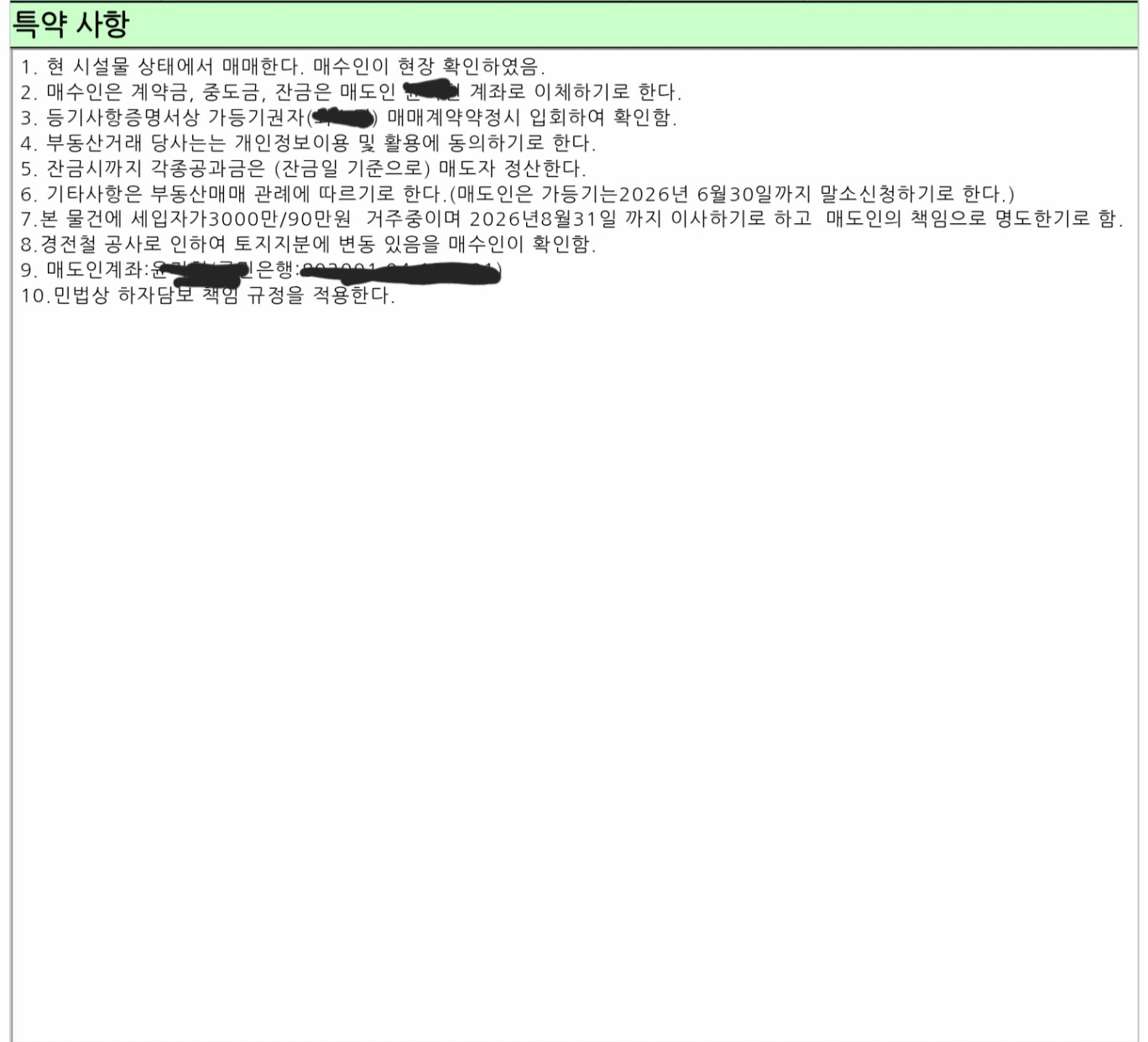현재 특약은 매매약정서 작성시 작성했던 특약인데 아래와 같이 수정&추가하지 않아도 될지, 제가 놓친 특약은 없는지 궁금합니다.