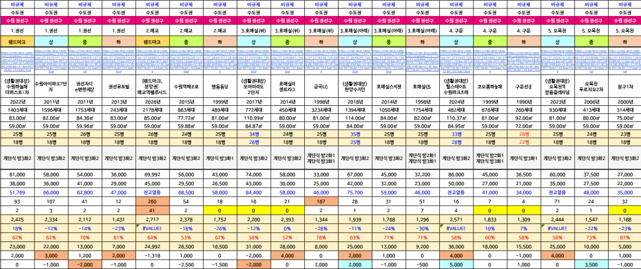 - 투자금 1억 후반 ~ 2억대 : 권선 생활권 준신축 단지, 중/하위 생활권 대장단지(신축)