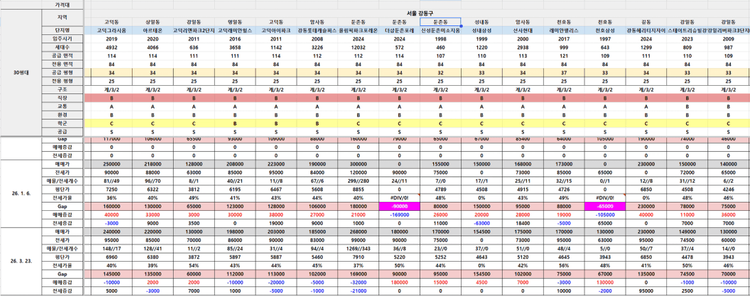 강동구 한달 사이 많이 매매개수가 늘었는데, 아무래도 다주택자 매물 때문인 것 같다. 그래서 그런지 호가가 조금 단지들이 보인다. 전세가격은 대부분 가격이 올랐는데 일부 전세가격이 떨어진 곳도 있음. 그렇지만 전반적으로 전세가격은 부족함. 전반적으로 거래 자체는 활발한것 같지 않다.